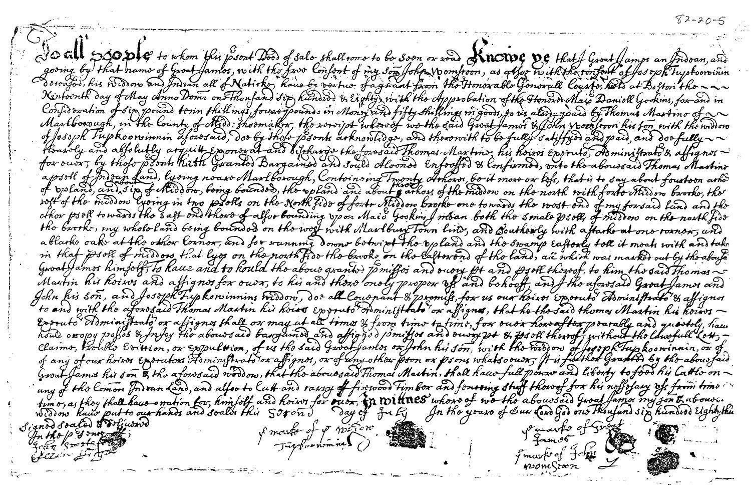In 1680, Fort Meadow was deeded from Great James, "an Indian,"to Thomas Martin, a shoemaker from Marlborough, for six pounds, ten schillings.
