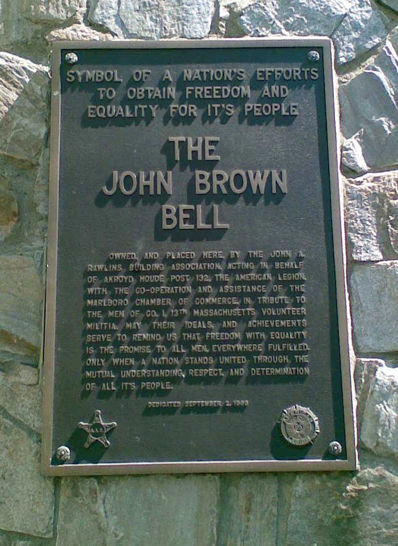 - Marlborough Historical Society member Joan Abshire, after months of exhaustive research in Massachusetts and West Virginia, wrote The John Brown Bell--The Journey of the Second-Most Important Bell in American History, from Harpers Ferry, West Virginia, to Marlborough, Massachusetts, pictured at right. More information on the John Brown Bell may be found here. This book is available as a free download here.